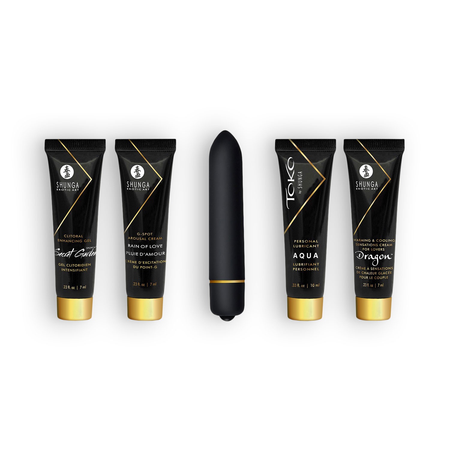 Este conjunto incluye: Lubricante de base acuosa (TOKO), Crema Intima (Dragon), Crema de clitóris (Jardín Secreto), Crema de Punto G (Lluvia de amor), Bala vibradora.