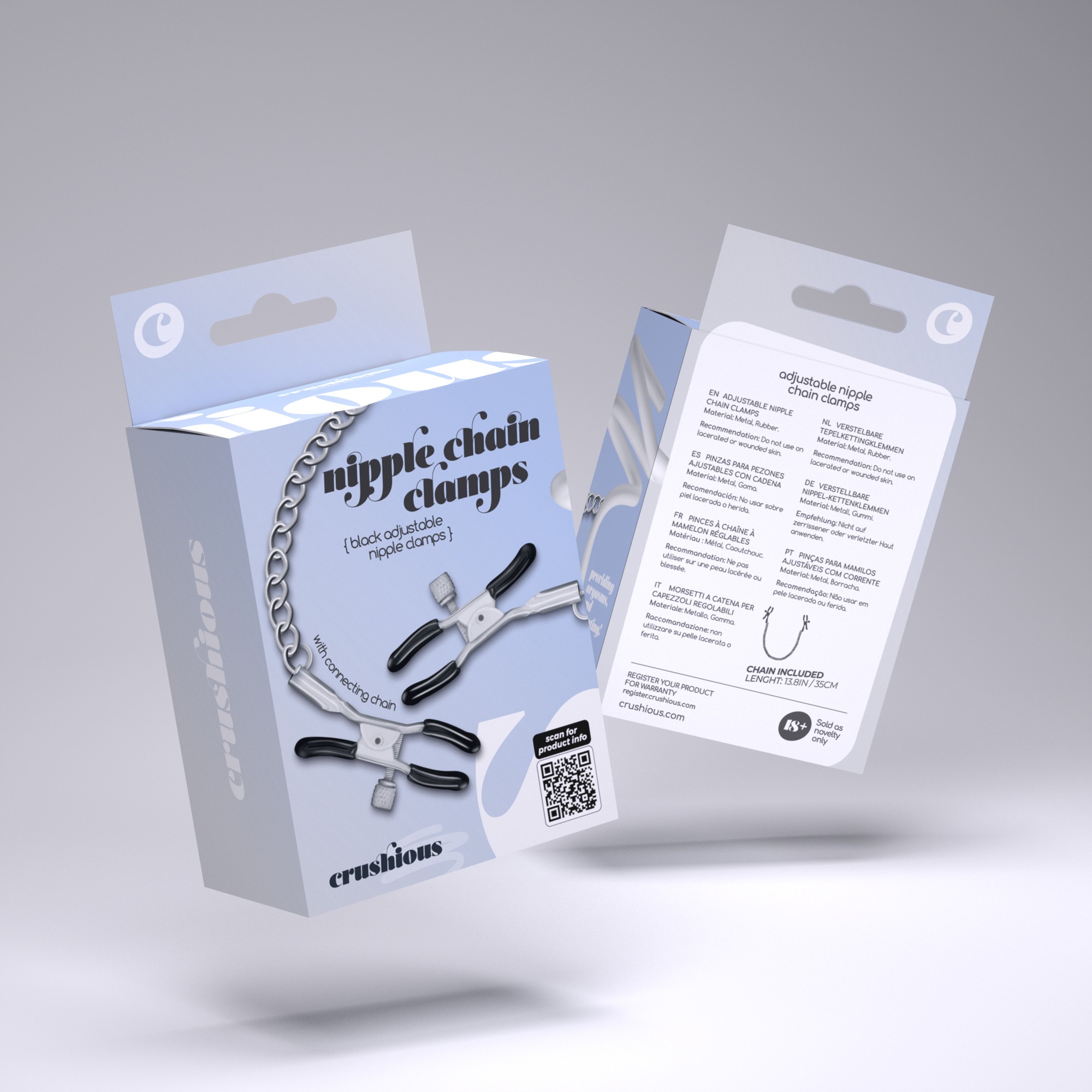 La cadena permite juegos de peso y unas caricias frías únicas y las pinzas ajustables permiten diferentes niveles de presión. ¡Todo esto gracias a las pinzas Silver Nipple Chain Clamps de Crushious!