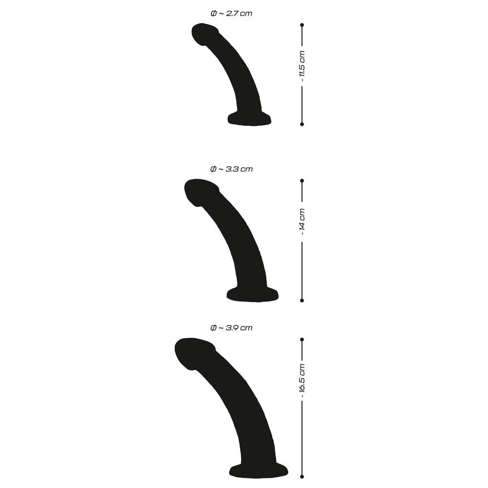 Dildo pequeño: longitud total 11,5 cm, longitud de inserción 10,3 cm, diámetro máximo 2,7 cm, peso 59 g.