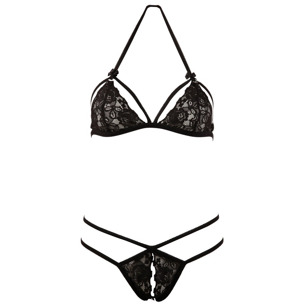 Este sensual conjunto despierta todos los deseos: un delicado sujetador sin aros, con escote halter, confeccionado en elegante encaje floral. Presenta detalles de tirantes y copas que se pueden doblar hacia abajo, creando un efecto aún más provocativo. El tanga a juego, sin entrepierna, incluye tirantes decorativos adicionales que le dan un aspecto extremadamente sensual y sofisticado.