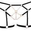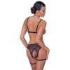 Sujetador sin aros y braguitas sin entrepierna de Cottelli LINGERIE, confeccionados en tiras de terciopelo elástico con cadenas y anillas en tono oro rosa. Las tangas tienen encaje elástico en la parte trasera. El sujetador tiene cierre de gancho en la espalda y tirantes ajustables para un ajuste perfecto. Incluye cadenas con ganchos a presión en el sujetador, algunas de ellas extraíbles. El tanga también cuenta con cadenas extraíbles con ganchos a presión. Las tiras ajustables para los muslos también se pueden quitar.