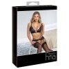 El corsé cuenta con una cadena ajustable y extraíble al estilo halter, así como tirantes regulables para un ajuste perfecto. El tanga con ligas está totalmente abierto en la zona de la entrepierna e incluye pequeñas cadenas estimulantes, también extraíbles. Las seis tiras de ligas y la cintura son ajustables, lo que garantiza comodidad y adaptación al cuerpo.