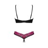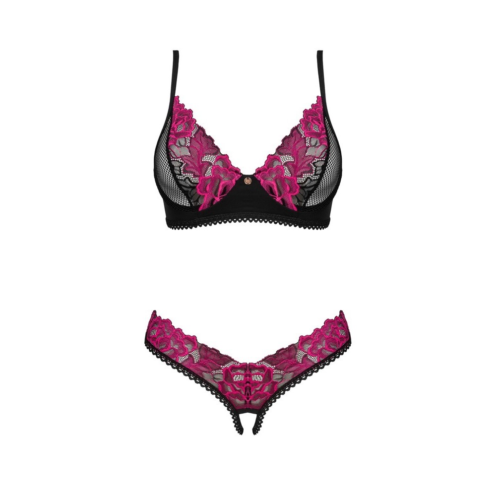 Conjunto Rosenty, de Obsessive, compuesto por sujetador con aros y tanga sin entrepierna. Suave tejido negro combinado con fino encaje rosa, creando una elegante mezcla con tejido elástico opaco. El sujetador presenta un delicado elemento decorativo entre las copas, armazón y cierre de gancho ajustable en la espalda, mientras que los tirantes son regulables para un ajuste perfecto. El tanga seduce con su cintura de encaje y su provocativa abertura en la entrepierna.