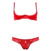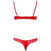 Conjunto en satén premium suave y brillante, realzado con delicados detalles de encaje. Sujetador ligeramente acolchado con copas con aros y tanga sin entrepierna. Color rojo.