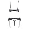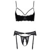 Conjunto de Cottelli LINGERIE compuesto por sujetador con relleno, liguero y tanga sin entrepierna. Todas las piezas están confeccionadas en encaje negro fino, suave y elástico, con el sujetador y el liguero decorados con anillos brillantes.