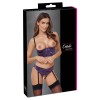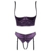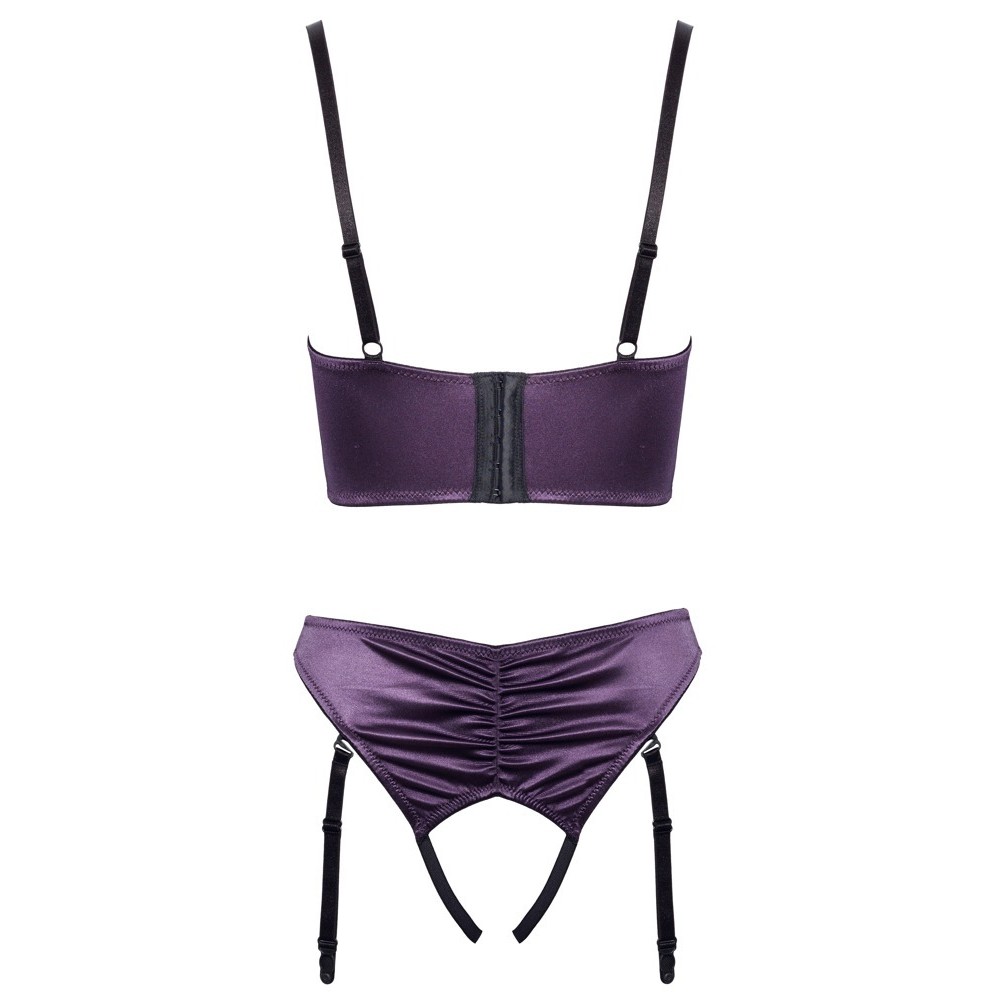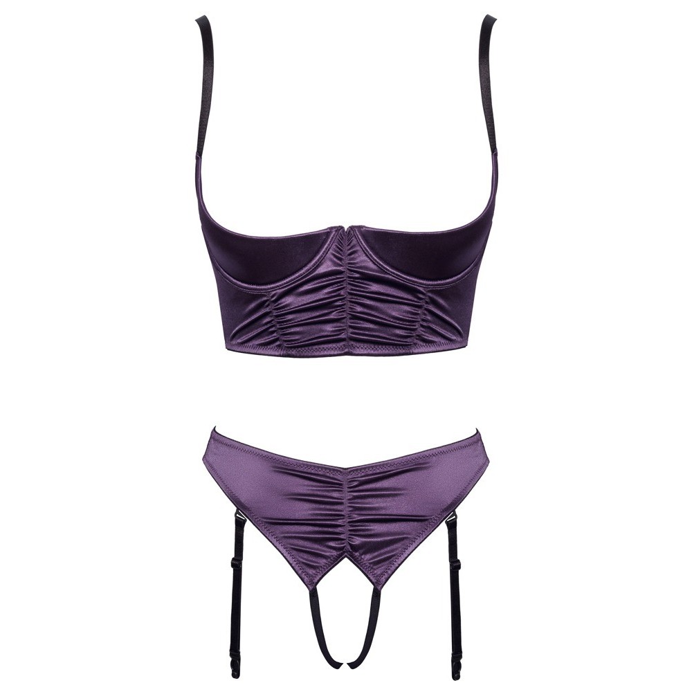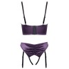 Conjunto de Cottelli LINGERIE compuesto por sujetador de copa cuadrada y tanga con ligas sin entrepierna. Está confeccionado en satén elástico morado oscuro, con un elegante efecto fruncido y detalles en negro.