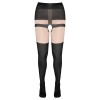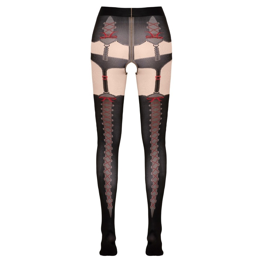 Medias ajustadas y suaves con tanga, liguero y efecto de medias integrados, creando un look completo y armonioso. La abertura en la zona de la entrepierna añade un toque provocativo, mientras que el estampado de lazos aporta un detalle sofisticado y femenino.