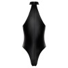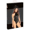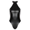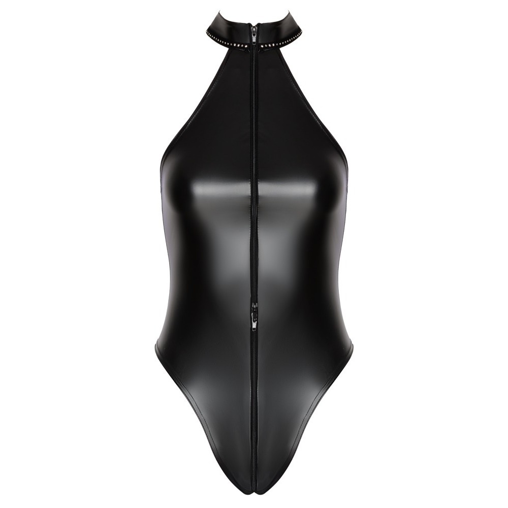 Body realzador de Noir en powerwetlook negro, que se ajusta como una segunda piel. Suave y muy elástico, garantiza la máxima comodidad. Modelo ajustado, sin hombros, con cuello alto decorado con brillantes de strass para un toque lujoso. La cremallera bidireccional, que recorre toda la longitud, se extiende desde el cuello, pasa por la zona de la entrepierna y termina por encima de las nalgas. Los cortes extra altos en las piernas realzan de forma provocativa las piernas y el trasero.