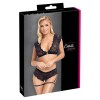 Encantador top combinado con una sofisticada tanga sin entrepierna, formando un conjunto en encaje negro de Cottelli LINGERIE. Ambas piezas están confeccionadas en encaje floral suave y elástico, lo que garantiza una gran comodidad. El top tiene mangas cortas y un escote profundo por delante y por detrás, con un anillo decorativo de strass en la parte delantera. En la parte trasera tiene una tira elástica ajustable y un cierre de gancho adicional para un ajuste perfecto. La tanga de cintura alta tiene tirantes ajustables en los muslos y un seductor diseño sin entrepierna.