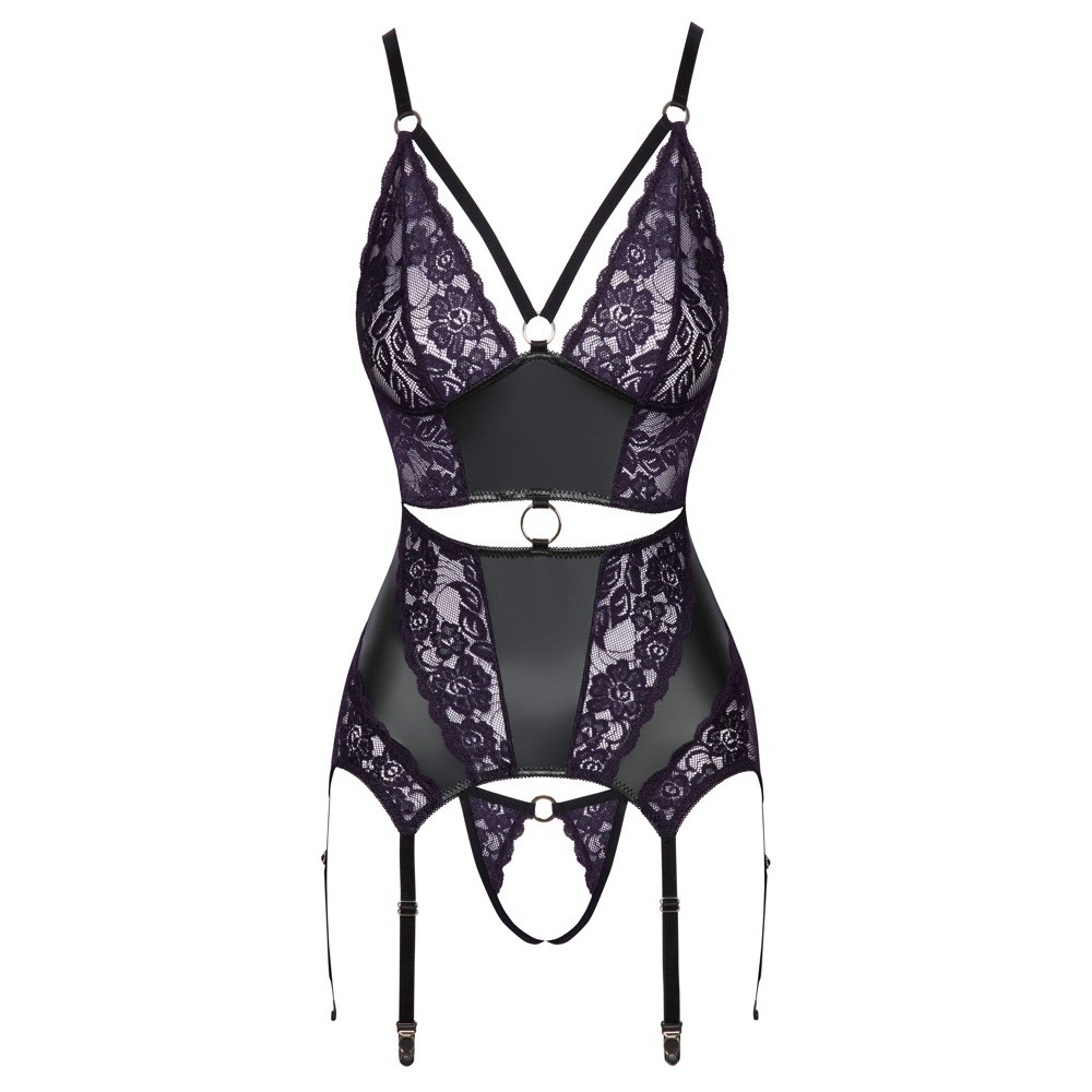Corsé y tanga sin entrepierna en un conjunto de Cottelli LINGERIE. Confeccionado en material negro mate con inserciones de encaje en la parte delantera en un elegante color morado oscuro. El conjunto es suave y elástico, lo que significa que es extremadamente cómodo de llevar. Tiene tirantes elásticos decorativos y un aro entre las copas de encaje suave. También hay un anillo plateado sobre el corte que se encuentra en la parte delantera de la cintura. Hay otro anillo en la cintura del tanga. Los tirantes del sujetador y las 6 tiras del liguero son ajustables. El cierre de doble gancho en la parte trasera también es ajustable. El pequeño tanga es seductoramente sin entrepierna.