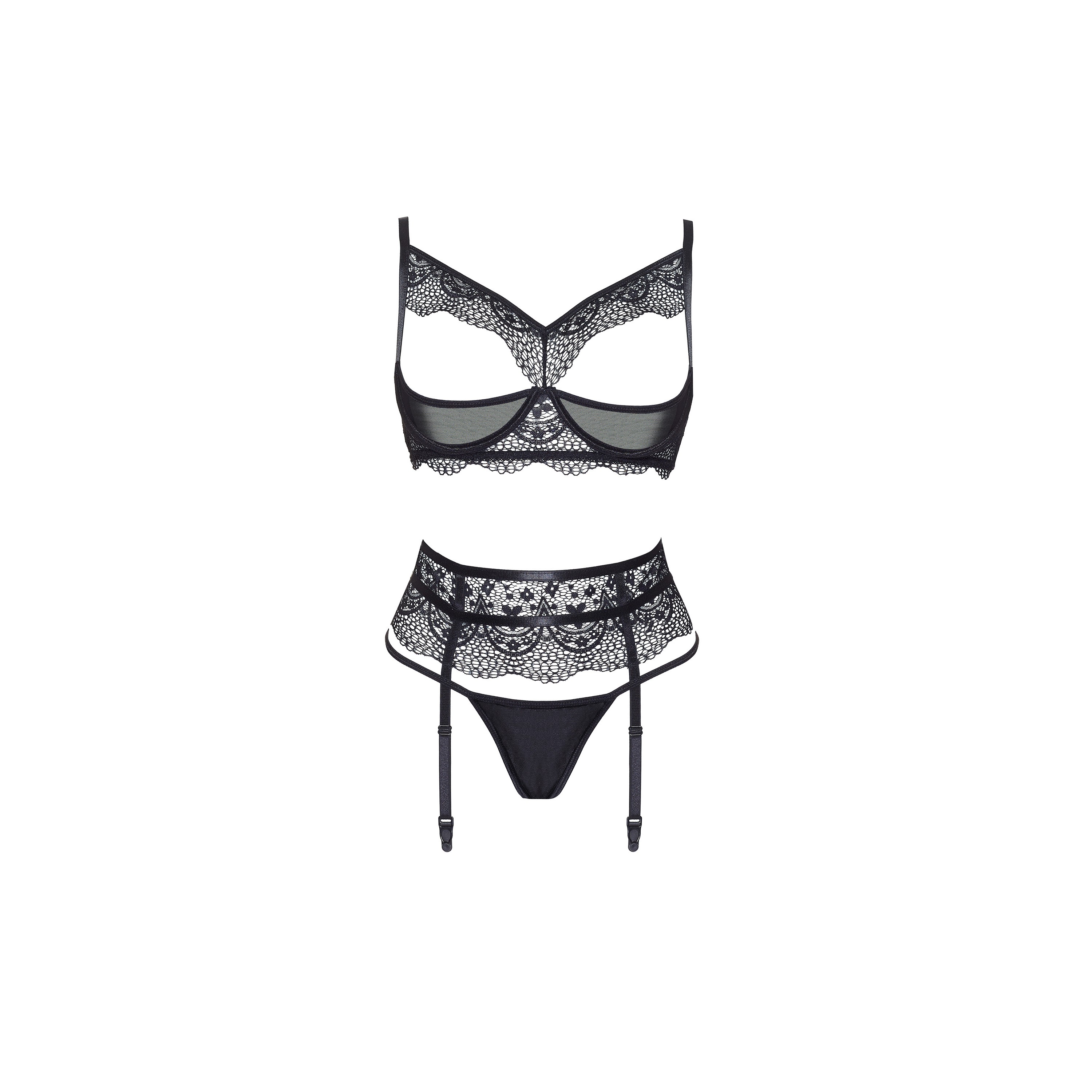 Clásico, pero a la vez muy sexy conjunto de ropa interior negro de tres piezas. Sujetador abierto de encaje y tul con aros. Un llamativo liguero sujeto con corchetes.