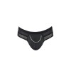 La tanga negra Tom 030 está confeccionada en piel ecológica combinada con una intrigante malla y una cadena metálica. El conjunto se complementa con los suspensorios, que realzan las nalgas.
