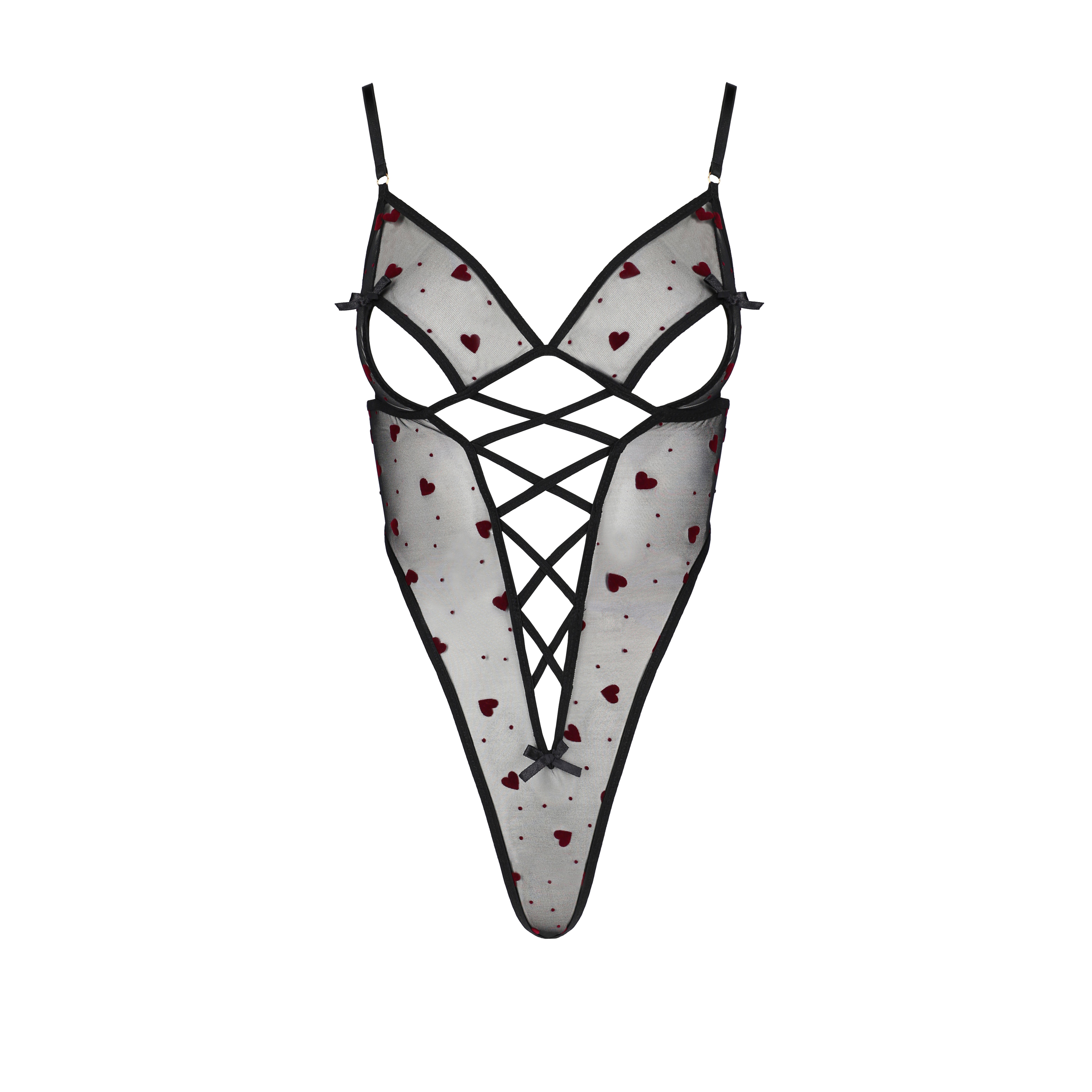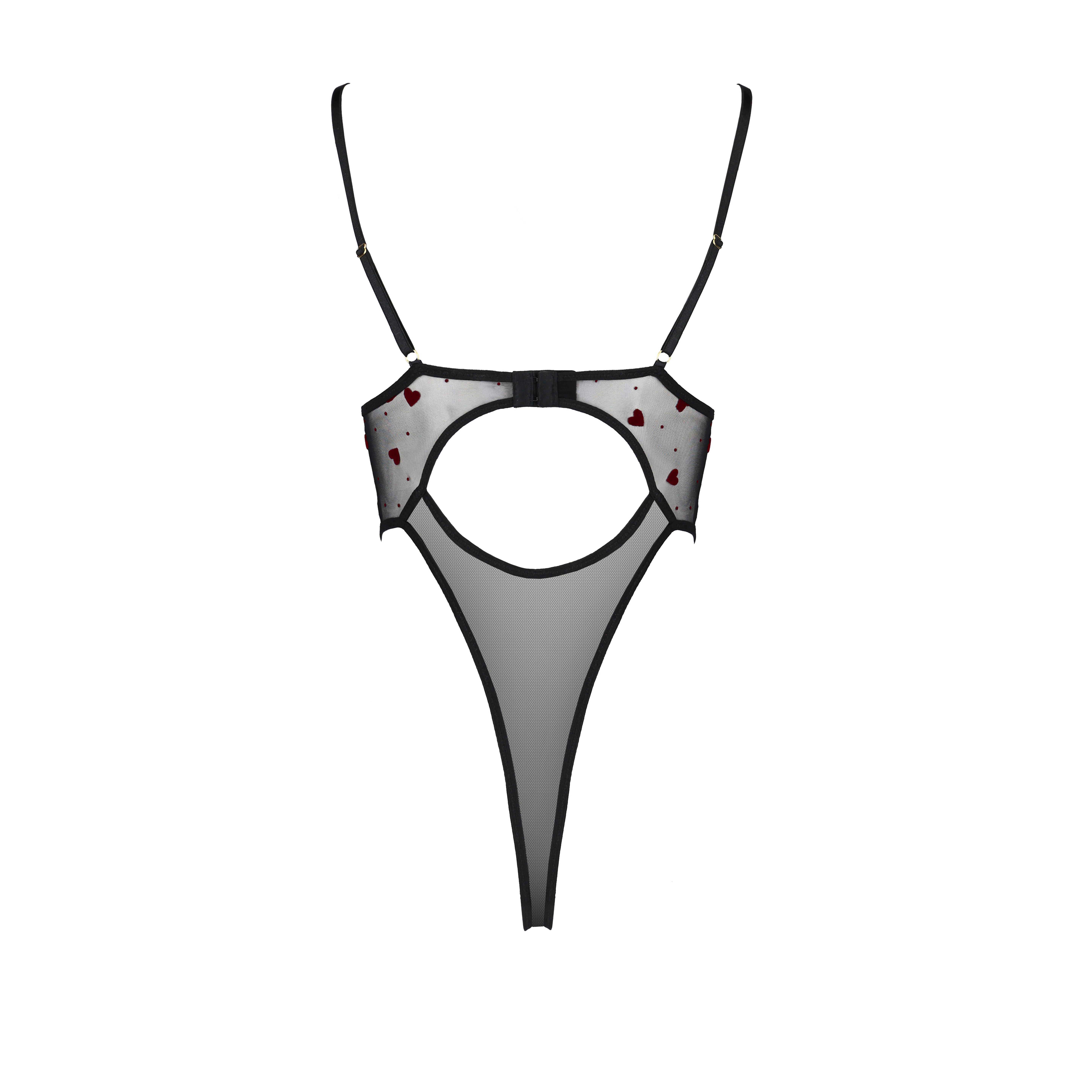 Este modelo destaca por su atrevido corte en tul transparente con estampado de corazones, que le confiere un toque romántico y sensual.