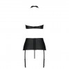 Compuesto por tres piezas irresistibles, incluye un top que se abrocha alrededor del cuello, un liguero y un tanga de corte atrevido, todo en piel negra de alta calidad.