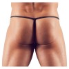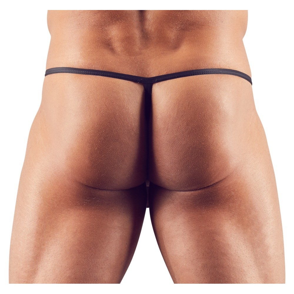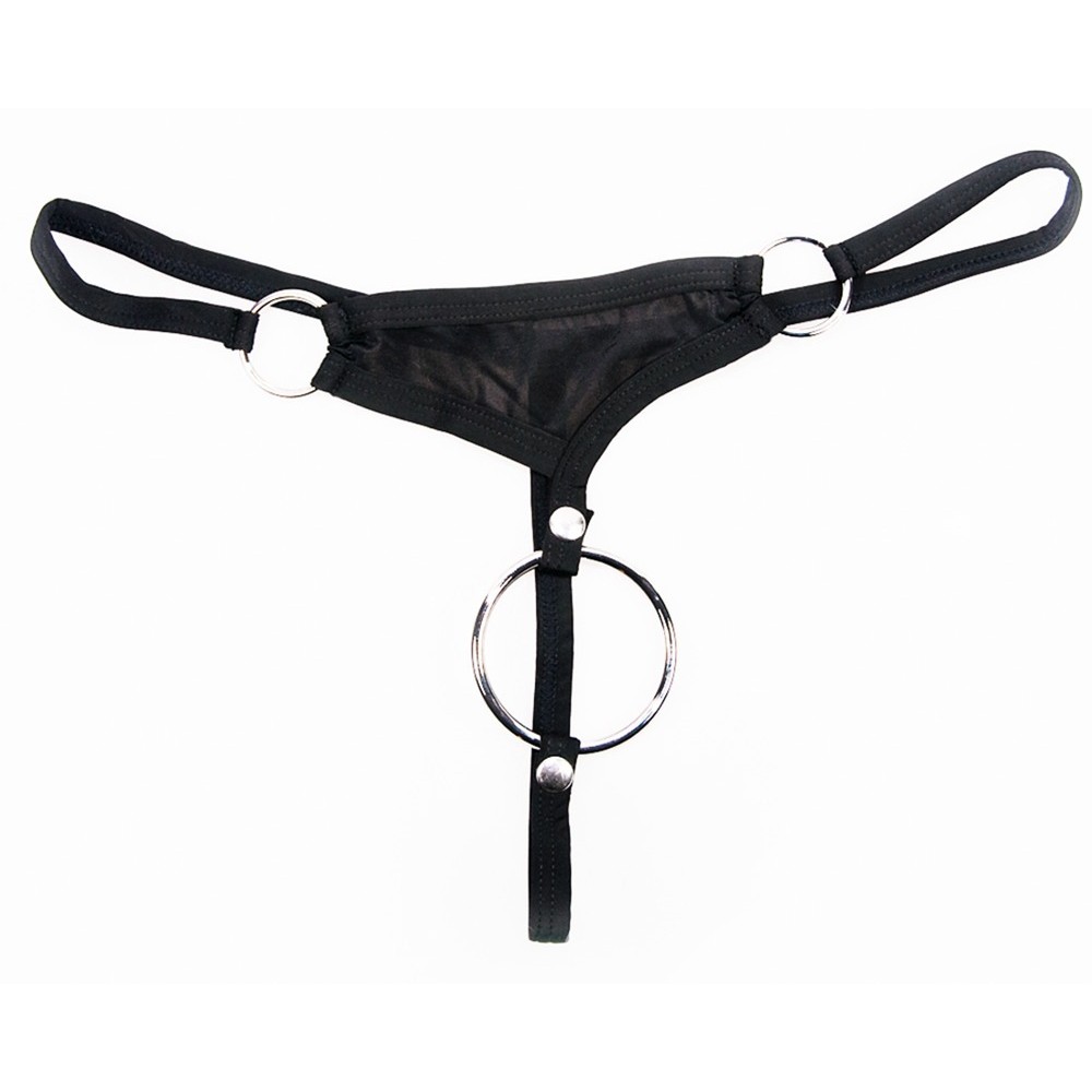 String noir avec anneau pour pénis amovible (fermeture à pression) (diamètre 5 cm). Le string est en microfibre douce et comporte des lanières fines et élastiques, recouvertes d'un tissu sensuel.