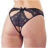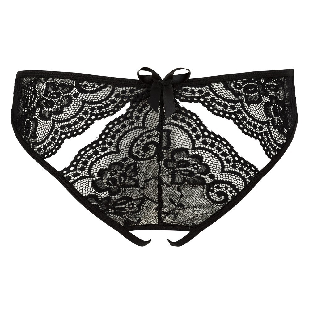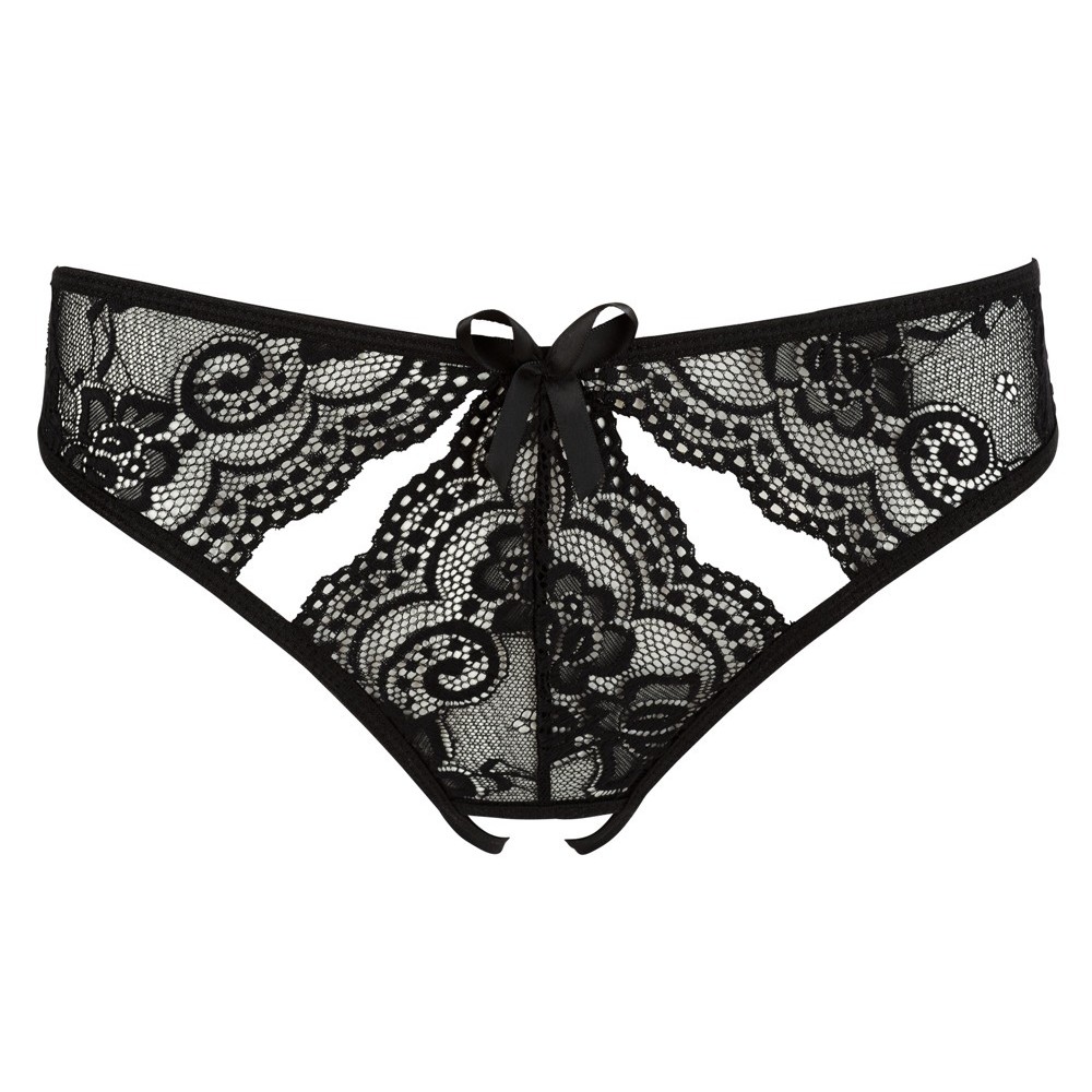 Ces culottes noires en dentelle se distinguent par leur style audacieux sans entrejambe et par leurs petites découpes délicates à l'avant et à l'arrière, qui ajoutent une touche séduisante et sophistiquée. Un modèle provocant qui met en valeur les courbes féminines avec charme.