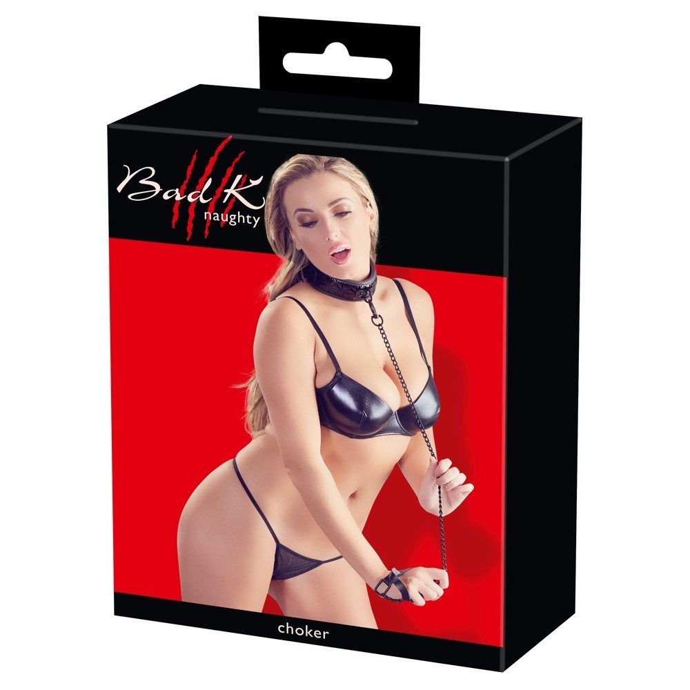 La laisse noire mate, équipée d'un mousqueton et d'une boucle de poignet, ajoute une touche de raffinement et complète la tenue.