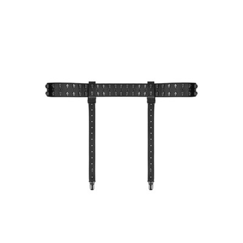 Ce porte-jarretelles noir de haute qualité, en cuir synthétique et décoré de têtes de mort, est un accessoire impressionnant pour la garde-robe de tout fétichiste.