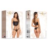 L'ensemble Nirvina est un ensemble de lingerie exquis qui séduit par sa combinaison de dentelle et de matière brillante semblable au latex. Le haut court avec armature, relié à la culotte par un fermoir, ressemble à un élégant body.