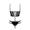 Un ensemble complexe fait de dentelle et de tissu wetlook. Le haut court avec armatures, relié par un fermoir aux ficelles, ressemble à un body.