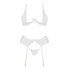 Voici l'ensemble de lingerie blanche sensuelle Rose set, qui comprend un soutien-gorge, un string et un porte-jarretelles.