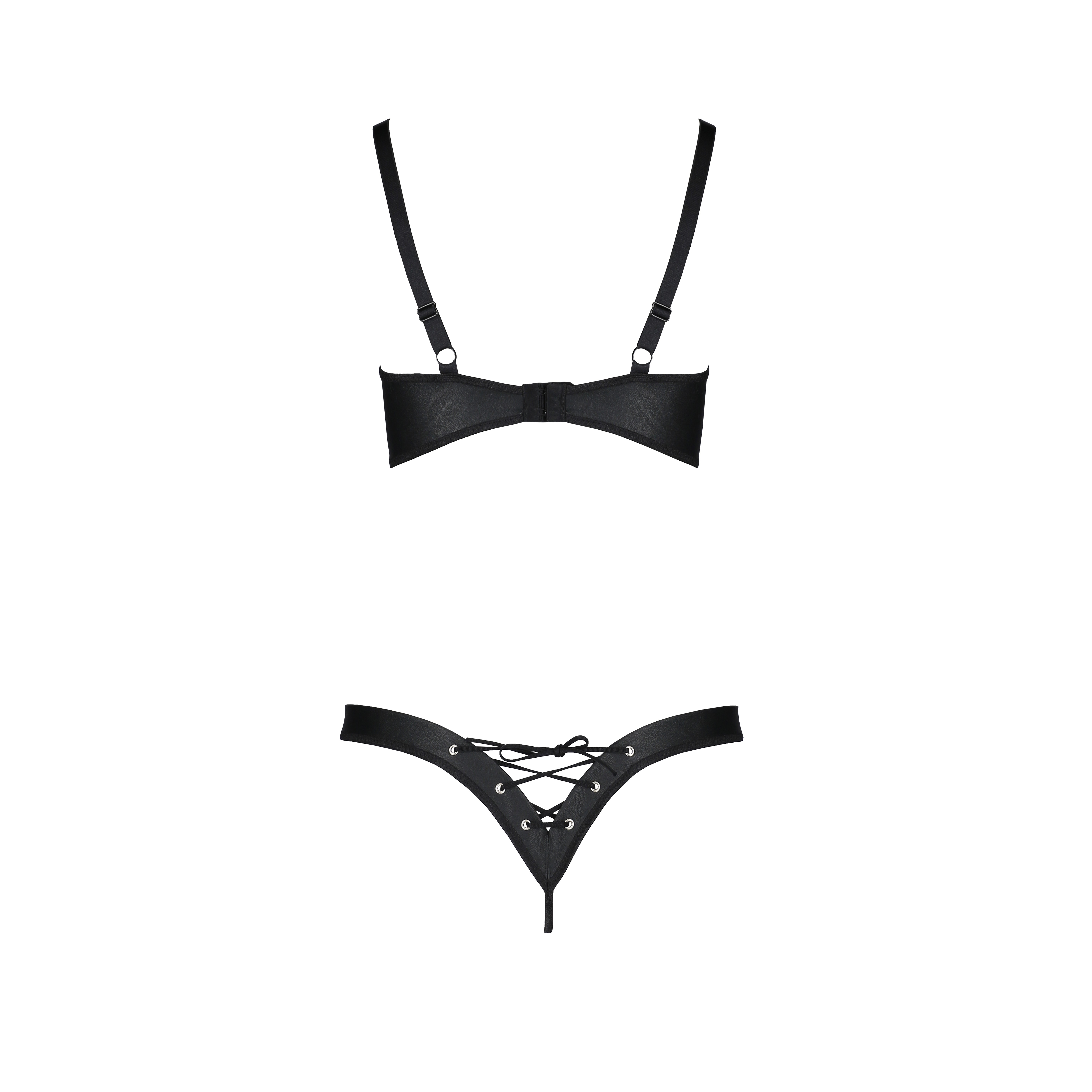 Le soutien-gorge ouvert est structuré par des bonnets renforcés et des armatures, pour un maintien sûr et un ajustement parfait. Le string audacieux est doté de liens réglables sur les côtés, permettant un ajustement personnalisé qui met en valeur vos courbes.
