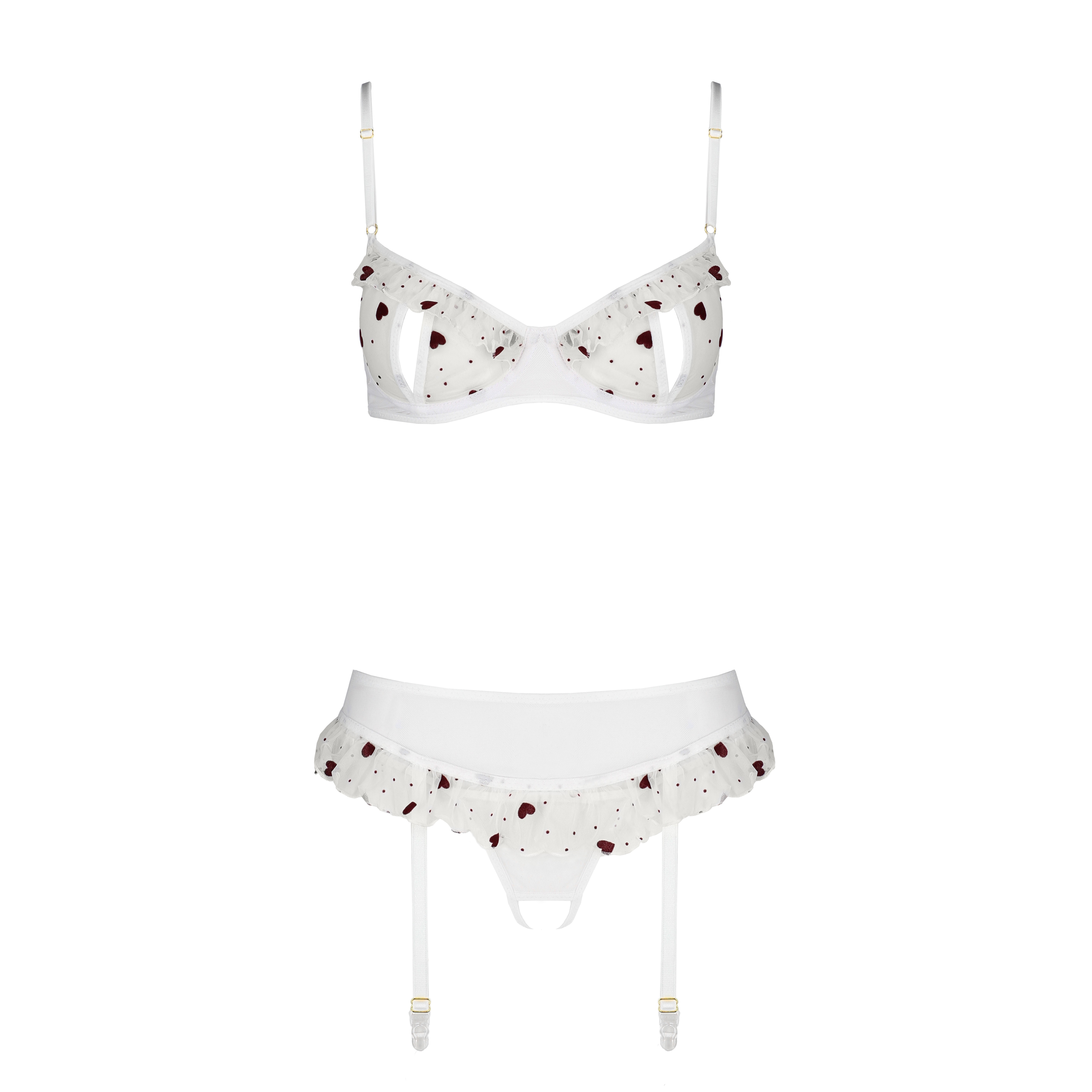 L'ensemble Lovelia 3 pièces en tulle à motifs de cœurs comprend un soutien-gorge aux ouvertures sensuelles, un délicat porte-jarretelles et un string ouvert, créant un look romantique et irrésistible.