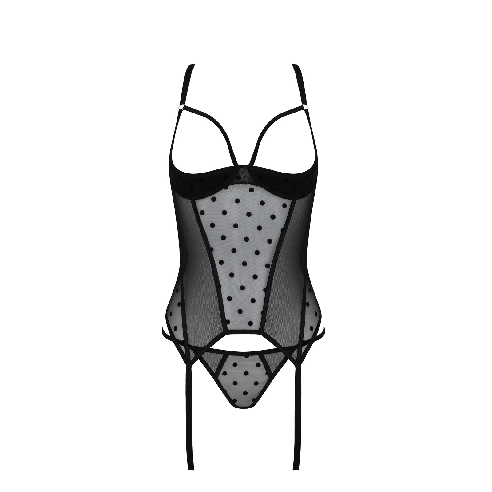 Le corset Martina de la collection Devil allie charme et sensualité grâce au tulle transparent et à l'élégant motif à pois. Les bonnets ouverts et les renforts garantissent soutien et confort, tandis que le string accompagne le design sophistiqué. Il est disponible en noir et en beige.