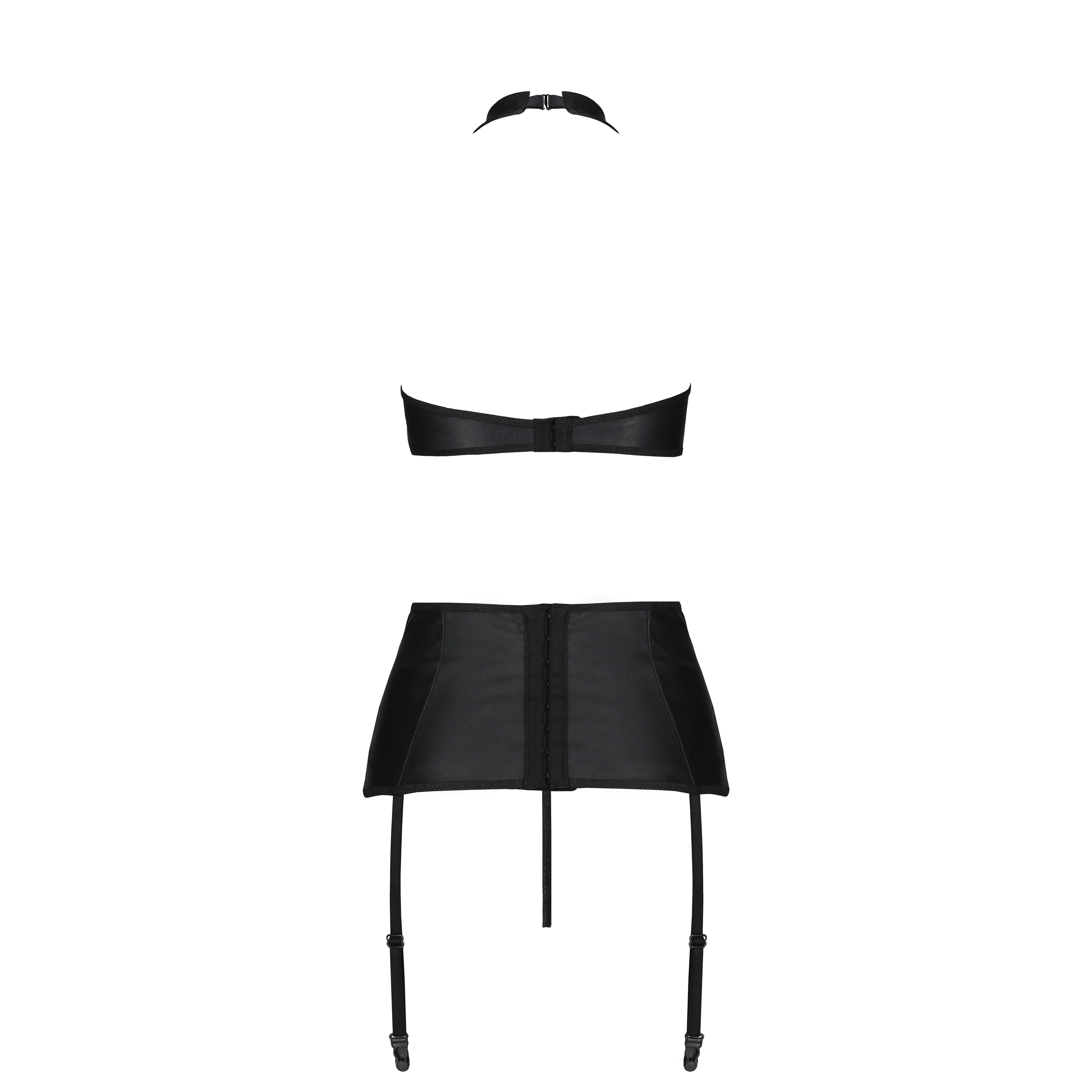 L'ensemble Nancy de Passion est composé de trois pièces en cuir noir, dont les bretelles croisées soulignent la sensualité féminine. Il comprend un haut moulant, un porte-jarretelles et un string, ce qui le rend idéal pour celles qui recherchent sophistication et audace.