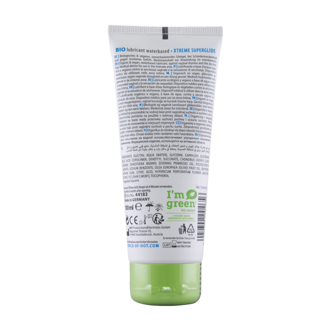 O CALDO SPETTACOLO BIO Superglide Estrema è un lubrificante scorrevole a base d'acqua che rimane liscio a lungo. È sicuro da usare in combinazione con preservativi e giocattoli sessuali. O CALDO SPETTACOLO BIO Superglide Estrema è un lubrificante completamente naturale in un tubo ecologico.