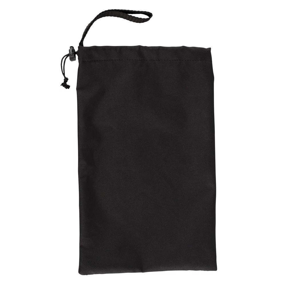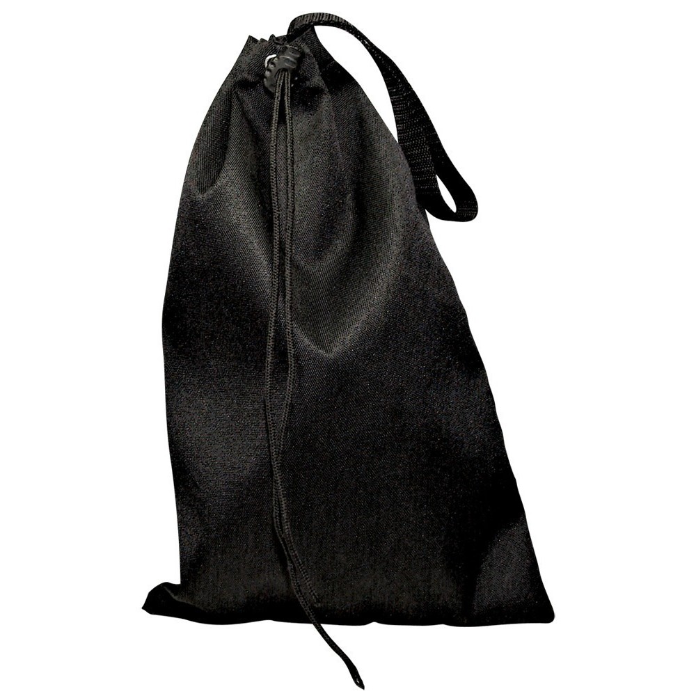 Borsa nera con chiusura a laccio. Dimensioni: circa 24 x 35 cm.