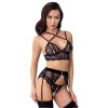 Set della linea Abierta Fina composto da reggiseno, reggicalze e perizoma senza cavallo, in pizzo nero elasticizzato con dettagli in velluto e accessori color oro rosa. Il reggiseno, dal taglio più lungo, presenta coppe con aperture e piccole chiusure a gancio sotto i lacci in raso, oltre a una chiusura a gancio sul retro.