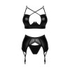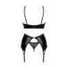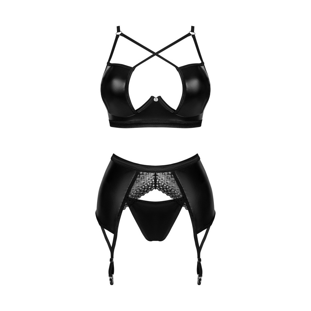 Set di tre pezzi Norides, di Obsessive, composto da reggiseno con ferretto, reggicalze e perizoma, in tessuto con effetto bagnato, elastico e morbido. Il reggiseno presenta un taglio sofisticato, con scollatura stravagante e spalline regolabili, nonché chiusura con ganci sul retro per una vestibilità perfetta. Il reggicalze include un inserto in pizzo sul davanti e chiusura con ganci sul retro, con cinturini regolabili. La perizoma con effetto bagnato seduce con un delicato triangolo di pizzo sul retro.