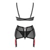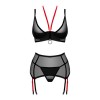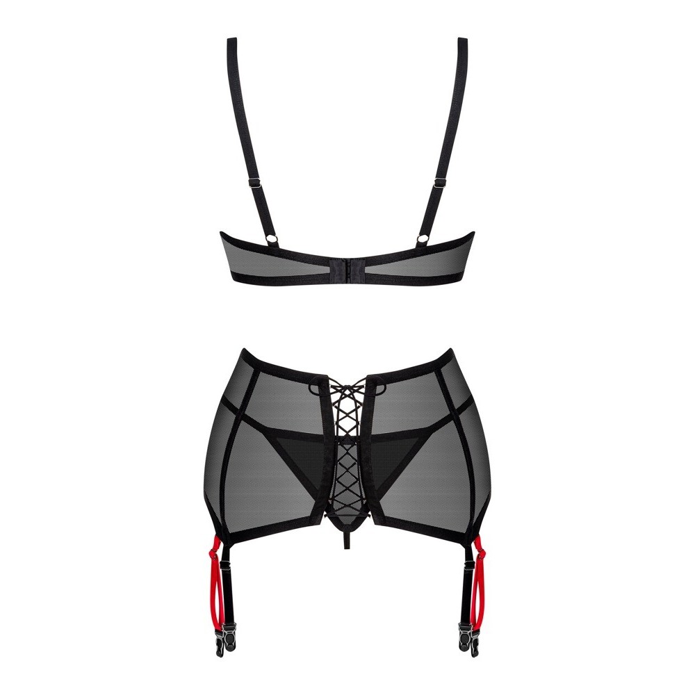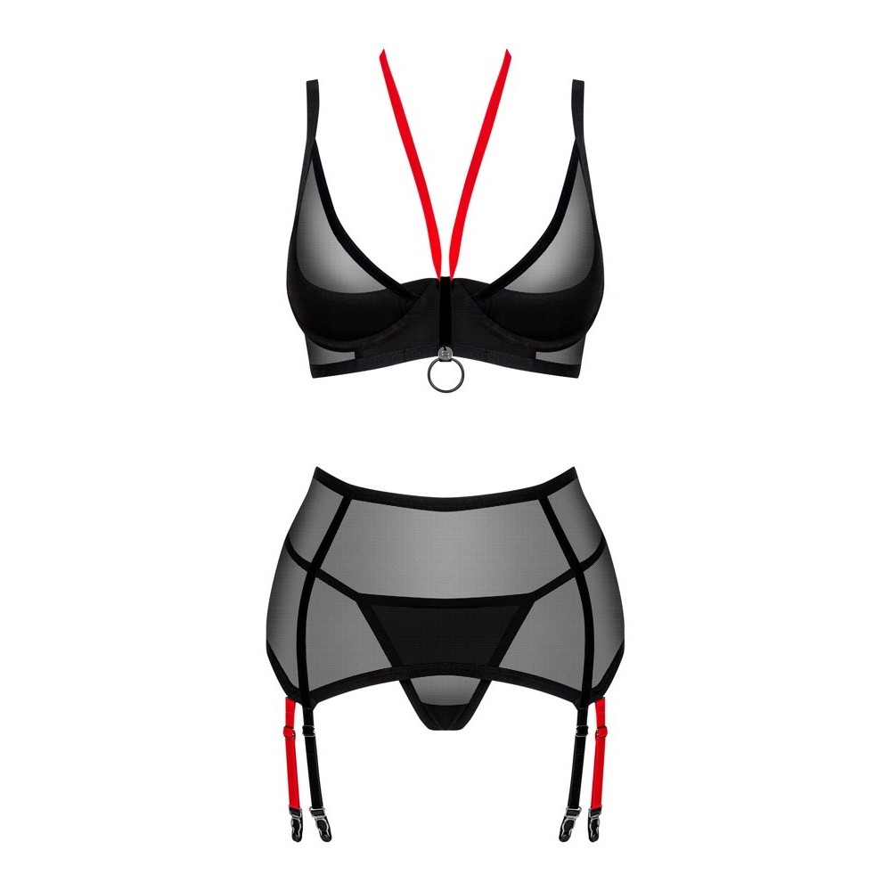 Set Glandez di Obsessive composto da 3 pezzi, composto da reggiseno con ferretto, reggicalze e perizoma. Tutto in sottile trasparenza nera, morbida ed elastica, che offre un comfort eccezionale. Il reggiseno presenta un mezzo anello rosso per un contrasto elegante, oltre a un anello e un piccolo dettaglio di gioielleria tra le coppe. Le spalline e la chiusura a gancio sul retro sono regolabili. Il reggicalze si distingue per il suo stile, con cinturini aggiuntivi e rimovibili in rosso a contrasto, per un totale di 8 cinturini regolabili. Un grazioso fiocco sul retro permette di adattare il reggicalze per una vestibilità perfetta.