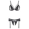 Questo completo a 3 pezzi si distingue per il suo seducente design in pizzo floreale. Il reggiseno, con spalline regolabili, presenta eleganti dettagli a strisce nella zona del décolleté e provocanti ritagli sulle coppe, impreziositi da un anello decorativo.