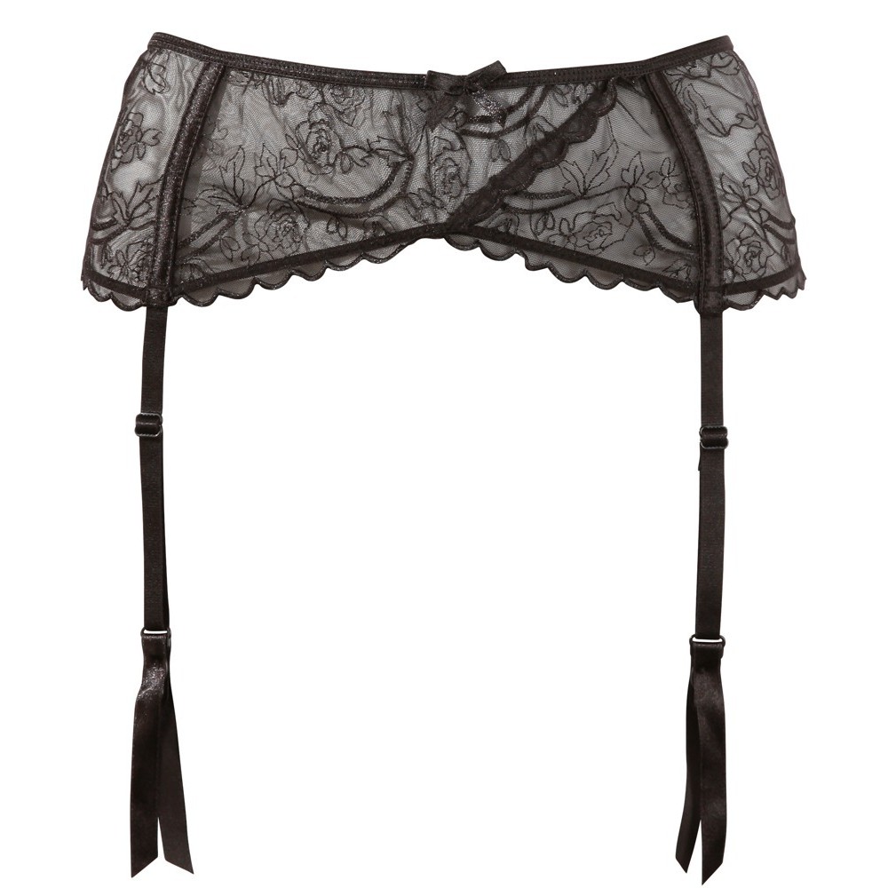 Reggicalze con quattro cinturini regolabili e chiusura a gancio con due file di ganci. Materiale nero trasparente con delicati ricami.