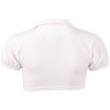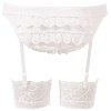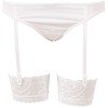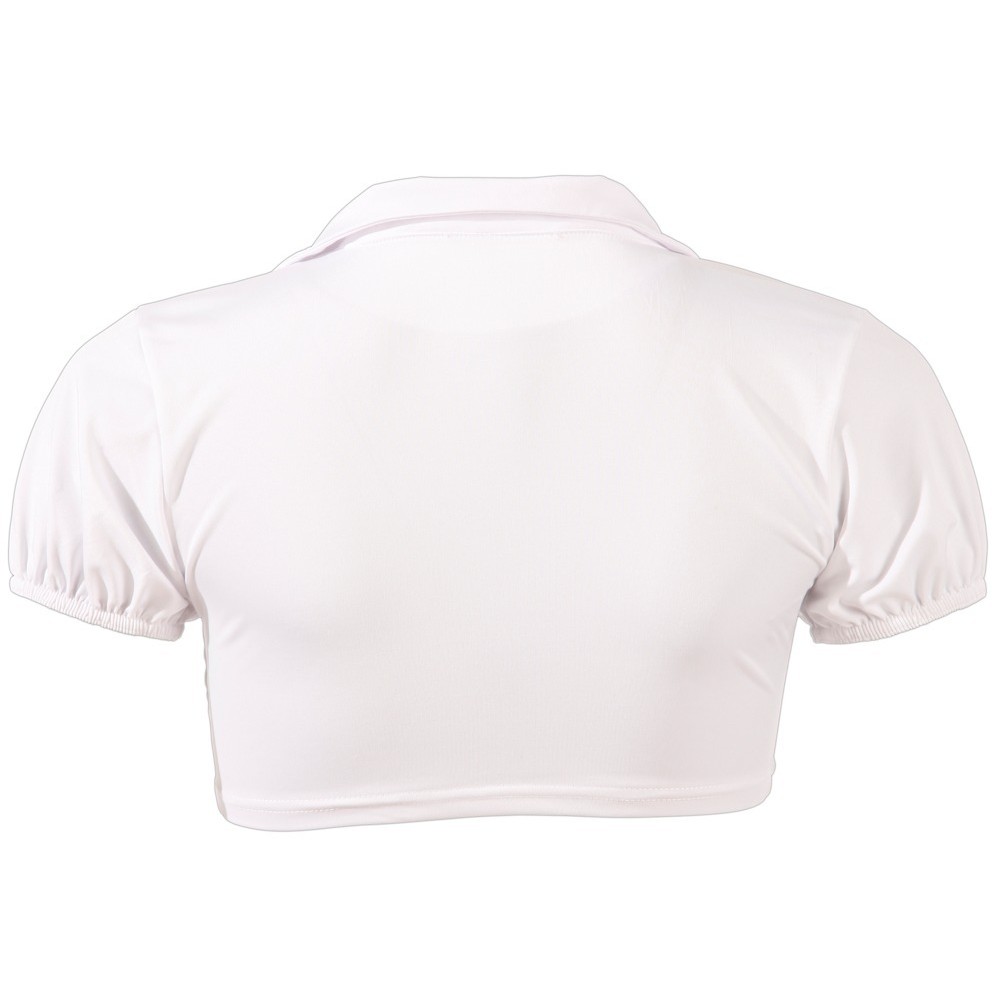 Top corto allacciabile, minigonna plissettata con spacco posteriore che rivela il perizoma con volant, reggicalze regolabili, chiusura con cerniera sul retro.