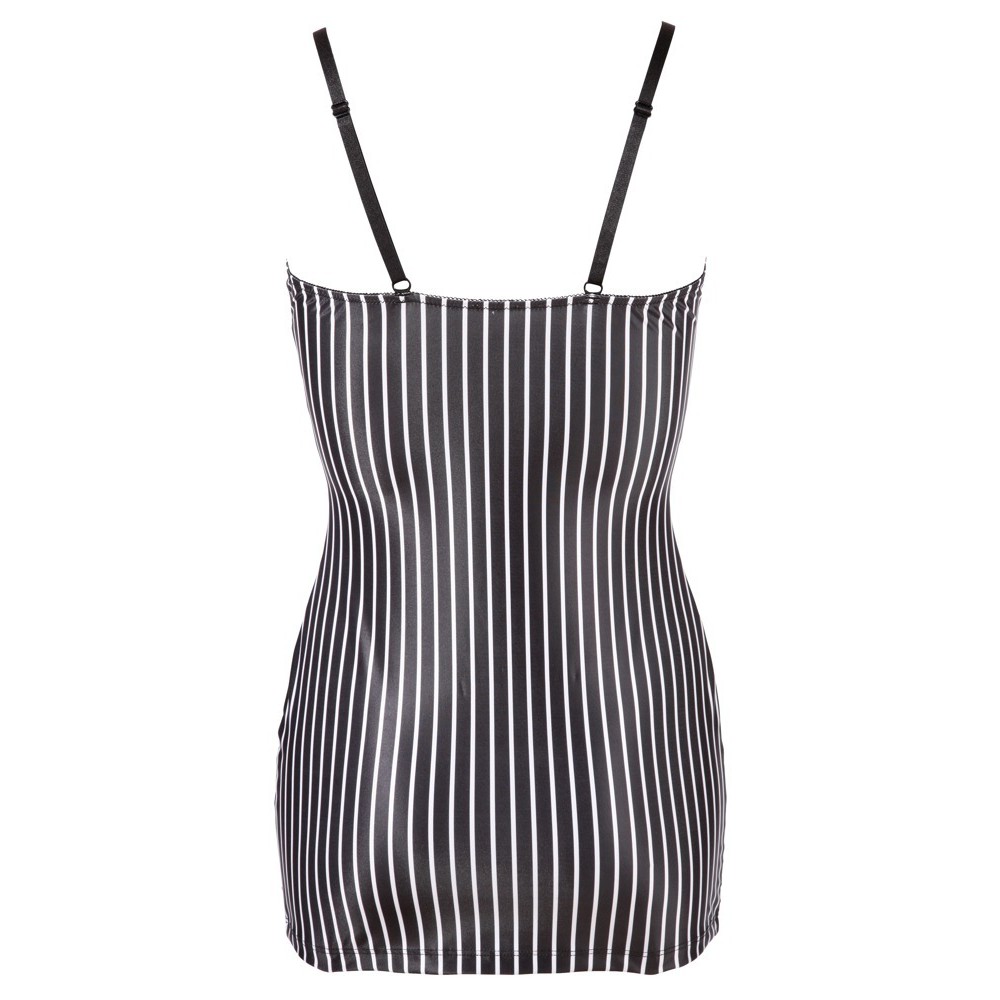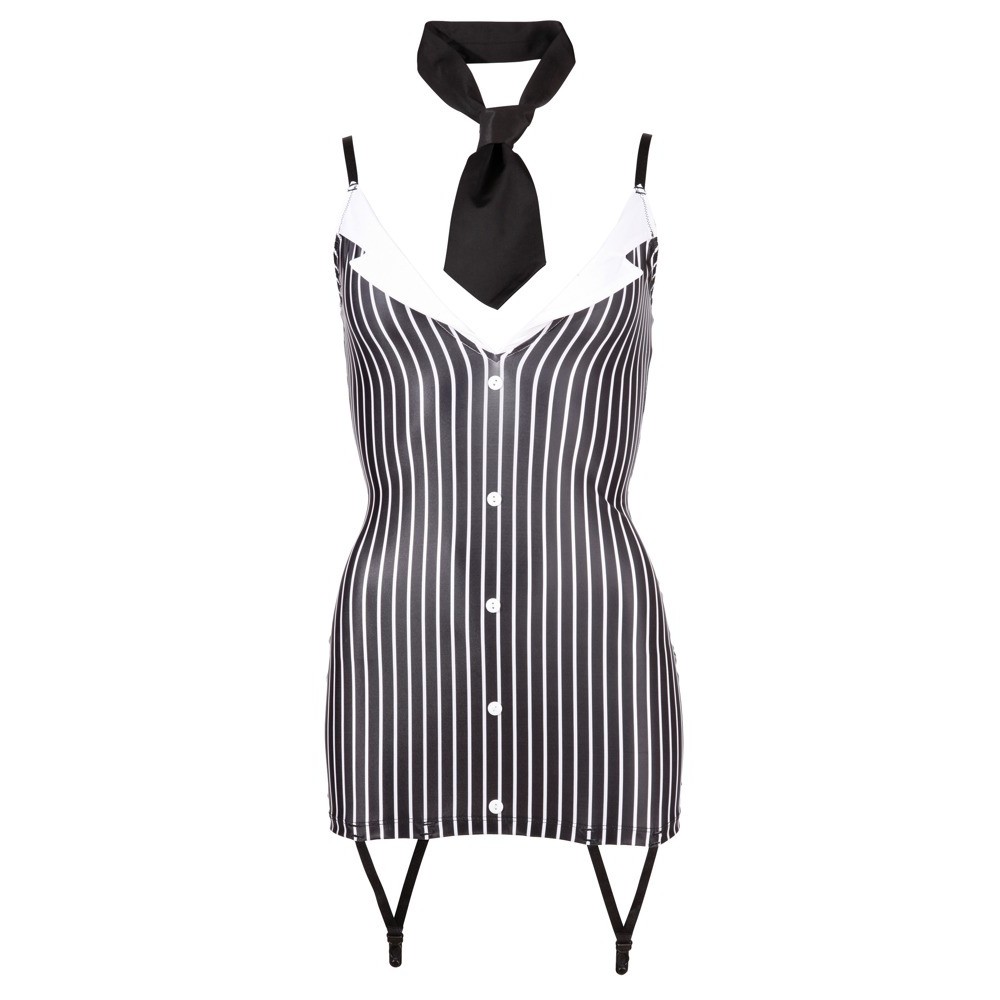 Abito aderente con spalline regolabili, due giarrettiere sul davanti, bottoni decorativi e leggero colletto sullo scollo. Cravatta inclusa.