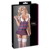Costume da studentessa con camicetta bianca scollata a maniche corte, colletto elegante e gonna a quadri blu/rossa plissettata con spalline incrociate sulla schiena e bretelle sul davanti.