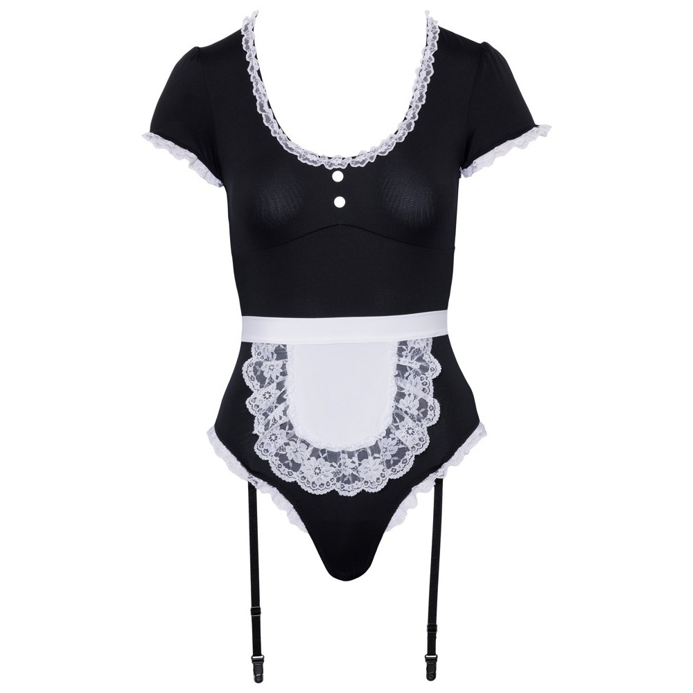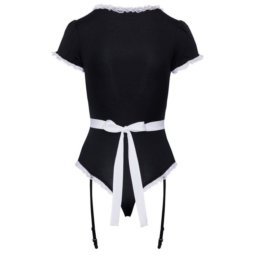 Questo costume da damigella Cottelli COSTUMES include un body con reggicalze e grembiule abbinato. Il body nero, morbido ed elastico, si distingue per gli eleganti volant di pizzo bianco intorno alla generosa scollatura, sulle maniche corte e sulle aperture delle gambe. Due piccoli bottoni bianchi decorativi sul davanti completano il look classico da cameriera. Il cavallo è dotato di pratiche chiusure. Le giarrettiere sono regolabili e completamente rimovibili. Il grembiule bianco, con volant in pizzo, si allaccia sulla schiena per una vestibilità perfetta.