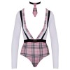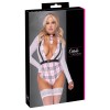 Il costume da studentessa di Cottelli COSTUMES è composto da un body a maniche lunghe e un colletto con fiocco abbinato. Combina tessuto a quadri opaco con tessuto bianco trasparente, creando un contrasto elegante e provocante. Realizzato in materiale morbido ed elastico per il massimo comfort. Il body presenta una scollatura profonda con fasce elastiche frontali in stile bretelle e una cintura decorativa con chiusura sul davanti. Il colletto include un piccolo fiocco a quadri e una chiusura regolabile sul collo.