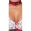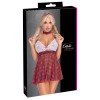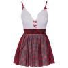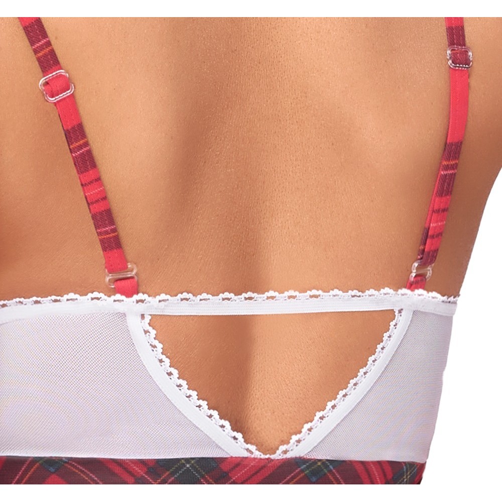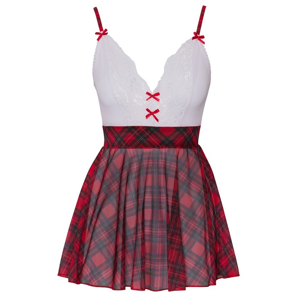 Costume da studentessa di Cottelli COSTUMES composto da abito corto con spalline e collana abbinata. Parte superiore bianca in tessuto morbido con pizzo delicato, decorata con fiocchi rossi. Le spalline scozzesi sono regolabili per una vestibilità perfetta. La gonna corta, svasata e a quadri è realizzata in comodo tessuto a maglia. Il collare a quadri è impreziosito da un ciondolo a forma di cuore con strass scintillanti e chiusura regolabile con gancio sul retro del collo.