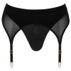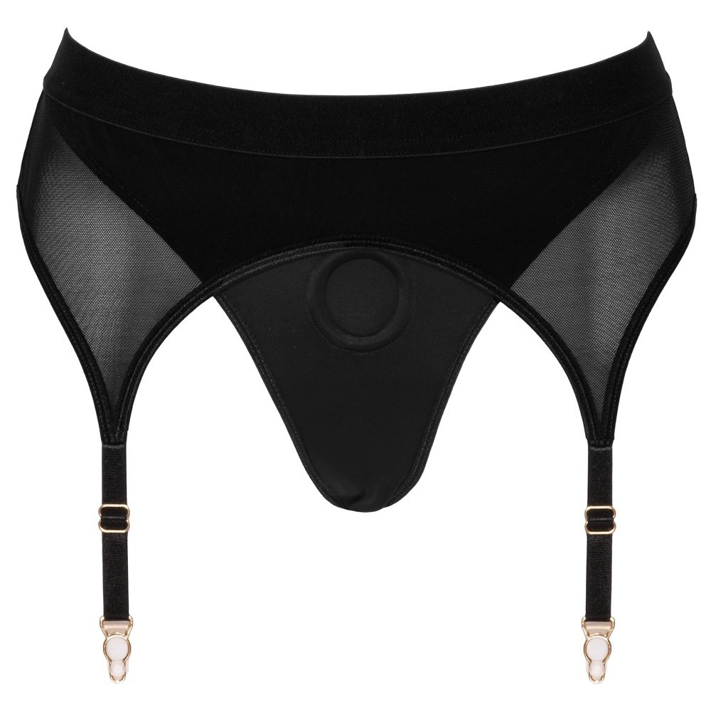 Perizoma strap-on nero di Bad Kitty in morbida microfibra abbinato a un reggicalze in morbido powernet. Il perizoma è a doppio strato sul davanti e presenta un'apertura e un anello elastico accuratamente integrato (Ø 3,5 cm) per inserire un dildo/vibratore con base di aspirazione. Le bretelle sono regolabili.