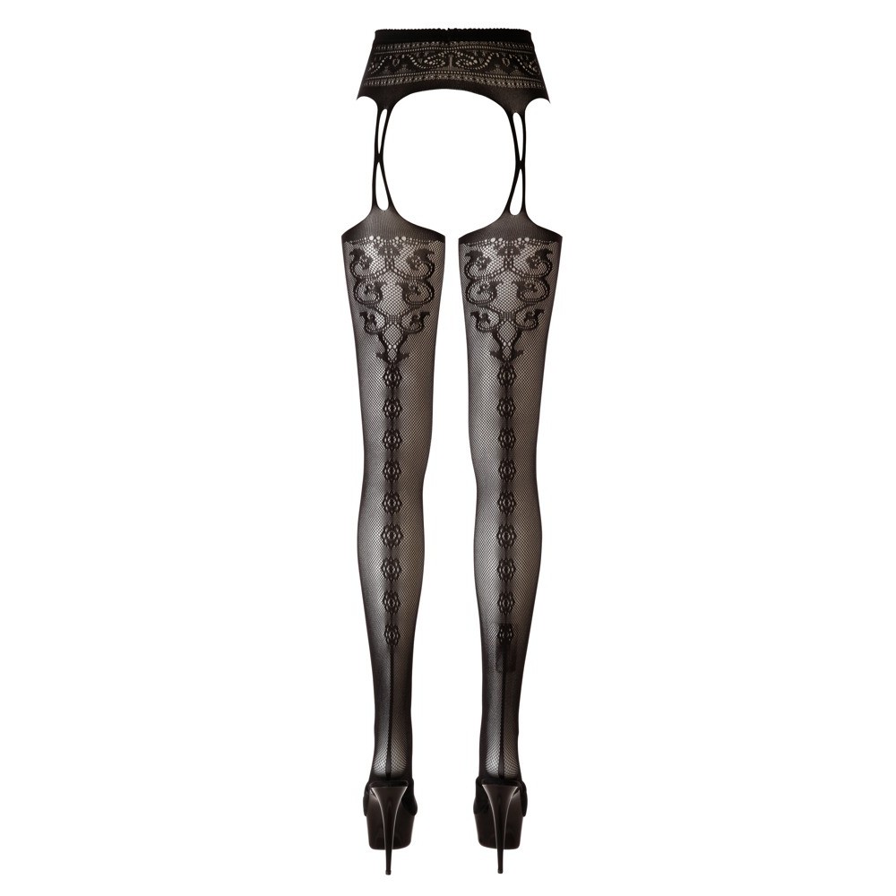 Calze con effetto reggicalze stravagante, invitante apertura nella zona inguinale. Con un eccitante effetto reggicalze. I collant sono realizzati in un delicato materiale a rete. La cucitura integrata sul retro completa questo look sexy.