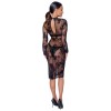 Abito a maniche lunghe di Noir, interamente realizzato in powernet elasticizzato, con una delicata stampa floreale in fiocchi di velluto. Lunghezza al ginocchio, con uno spacco di 18 cm sul retro. Il collo alto si chiude con un piccolo bottone sopra un elegante taglio ovale sulla schiena.