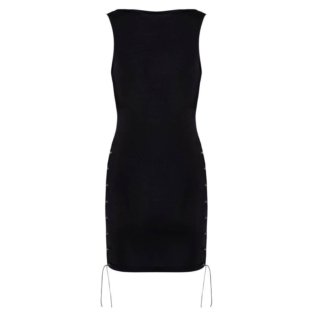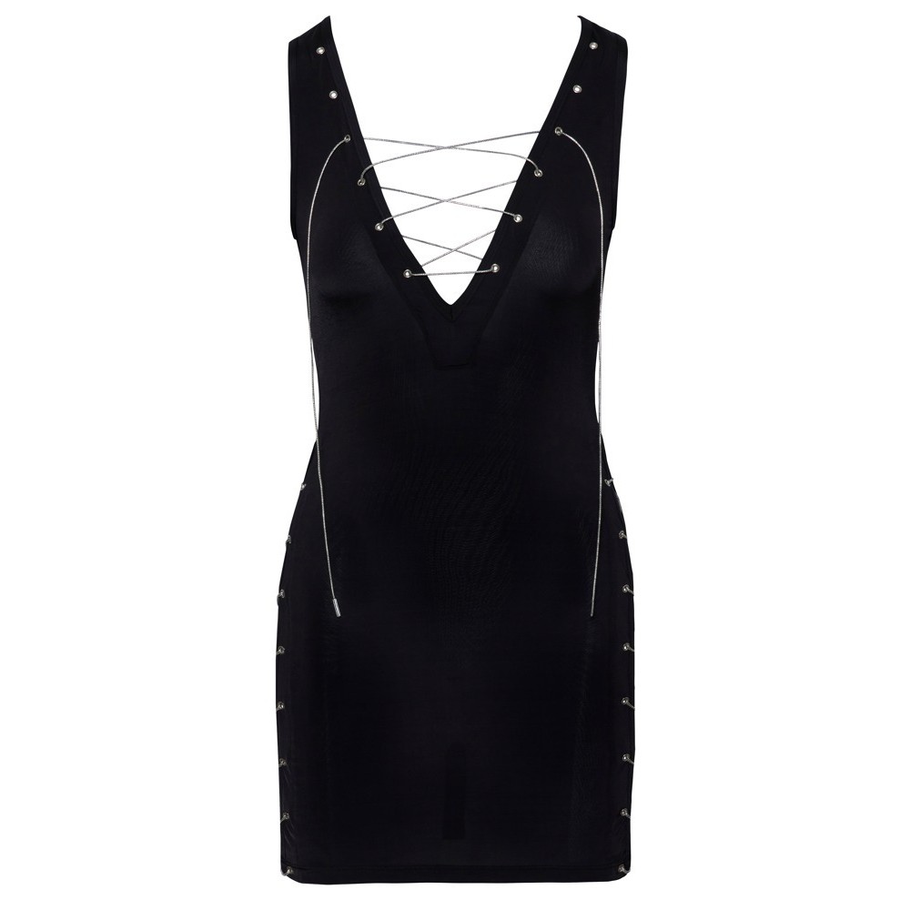 Abito corto e aderente in nero semitrasparente con un elegante e sottile luccichio. Morbido ed elastico su tutto il corpo, garantisce un elevato comfort. La profonda scollatura a V sul davanti e i lati della gonna presentano occhielli argentati iridescenti con cordoncino argentato, che formano un eccitante fiocco regolabile a proprio piacimento.
