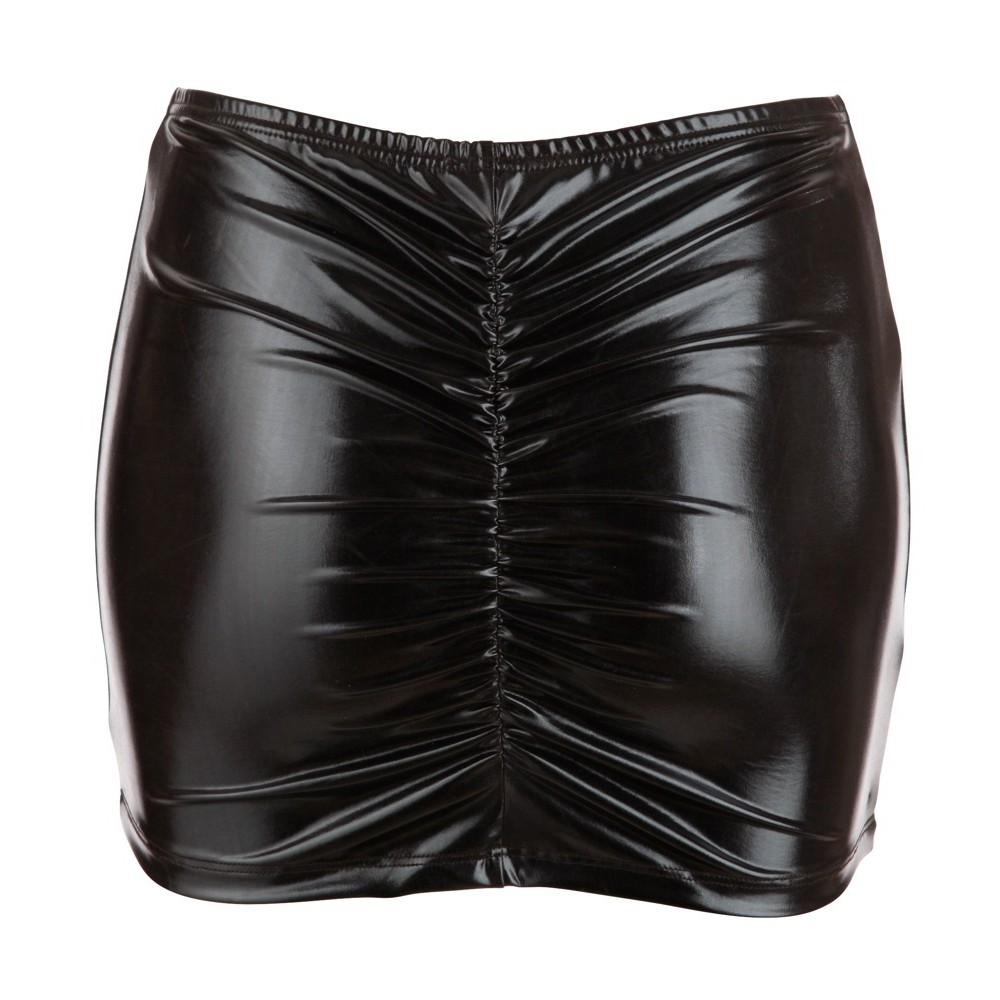Questa minigonna provocante è realizzata in wet look nero e valorizza perfettamente il sedere grazie ai volant sul retro.