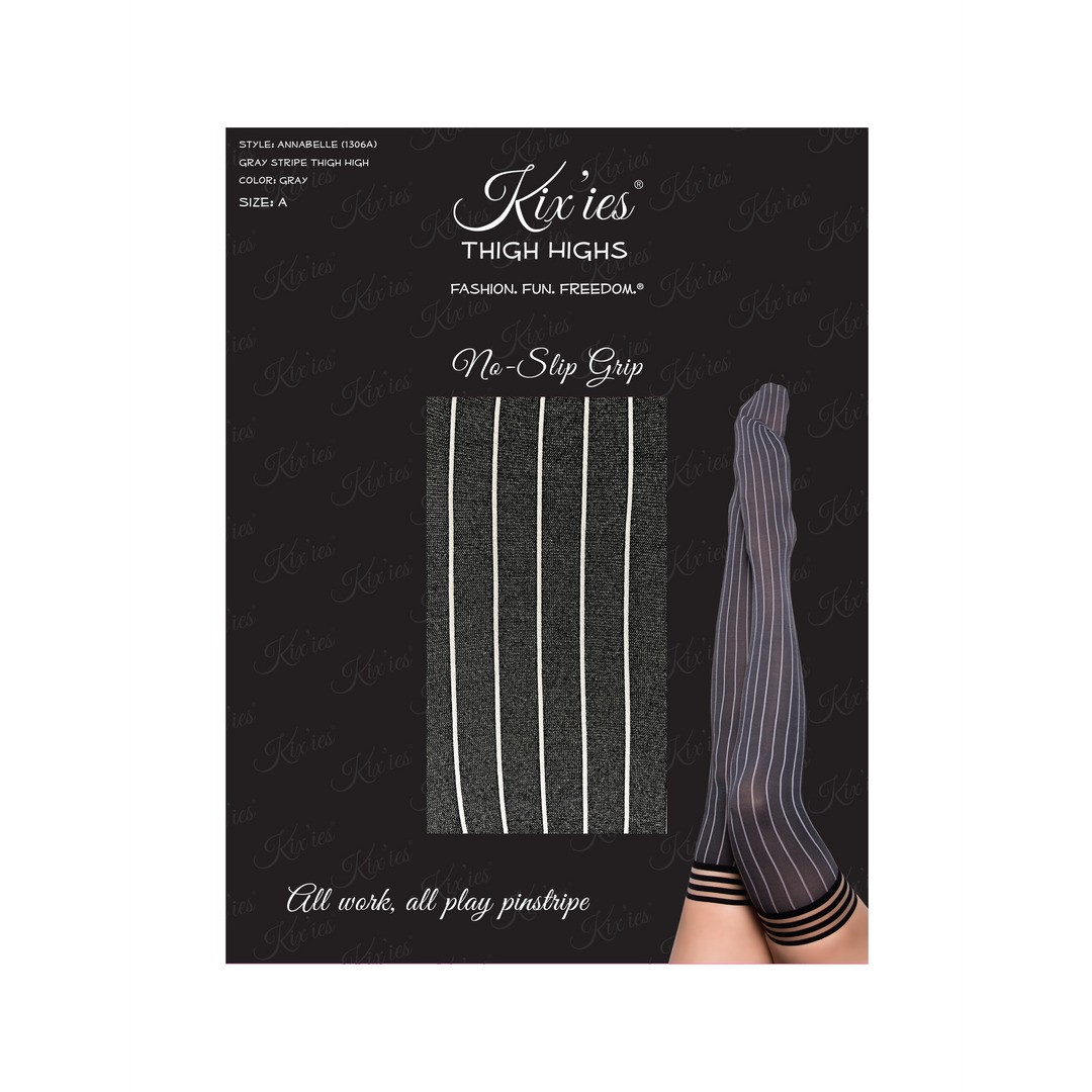 Kix'ies Annabelle è la calza autoreggente grigia a righe che non può mancare nel tuo guardaroba! Queste calze a righe lasciano le tue gambe in mostra per giorni!