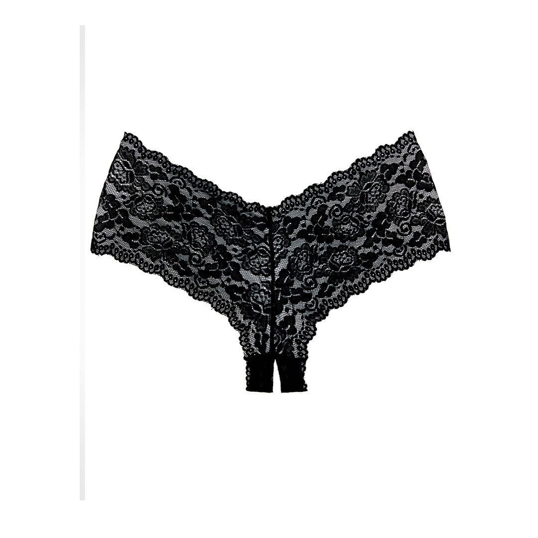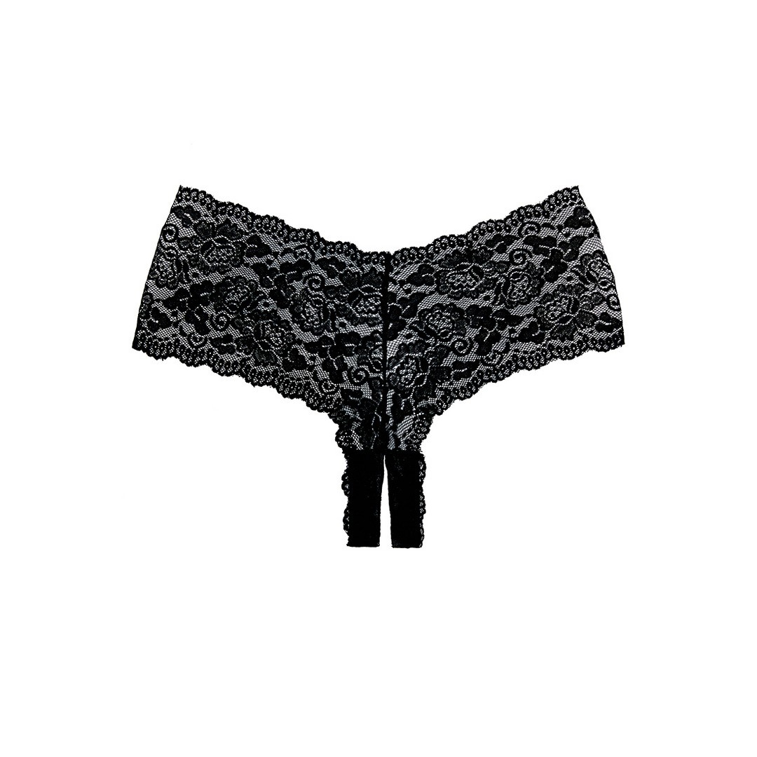 Il classico pantaloncino in pizzo è diventato selvaggio con un tocco crotchless, che abbraccia i fianchi e addolcisce il derriere.