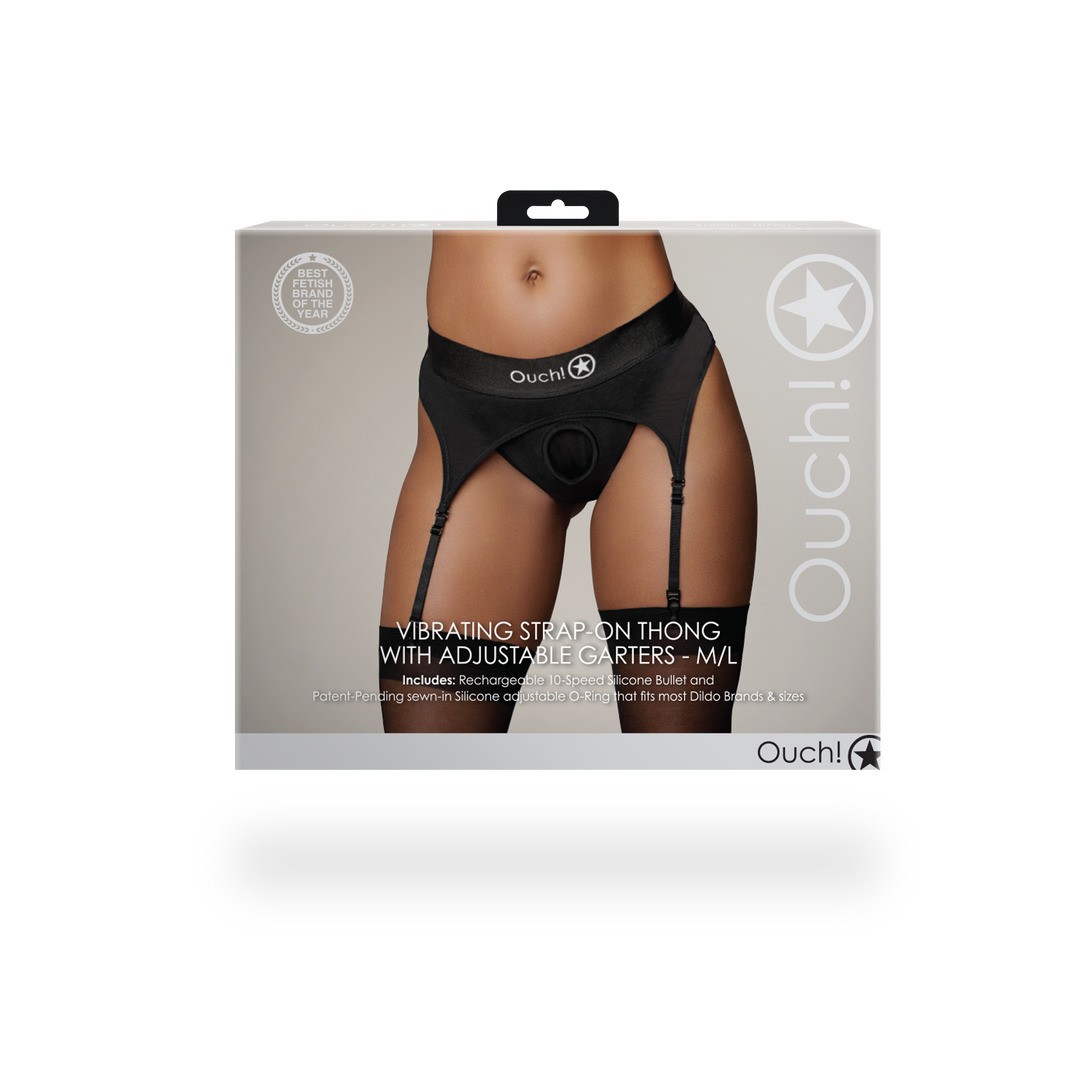 PERIZOMA STRAP-ON CON VIBRAZIONE E REGGICALZE NERI OUCH!